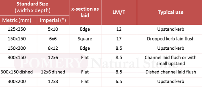 Natural stone kerbs can be supplied in gauged lengths but are normally supplied allowing for variation, e.g. 800-1100mm. This enables less wastage on the block.