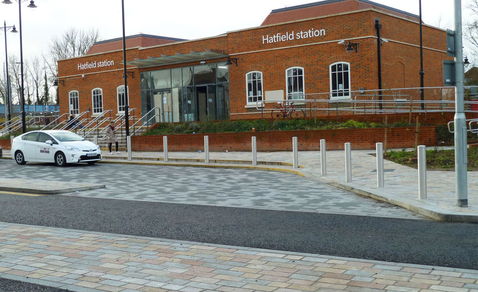 Looking down from the station, corduroy tactile paving and multicolour granite setts, over 1000 M2 supplied.