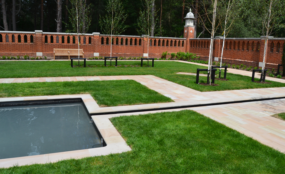 The granite monument on a raised platform surrounded by the water feature and copings in Forrest Brown sandstone.